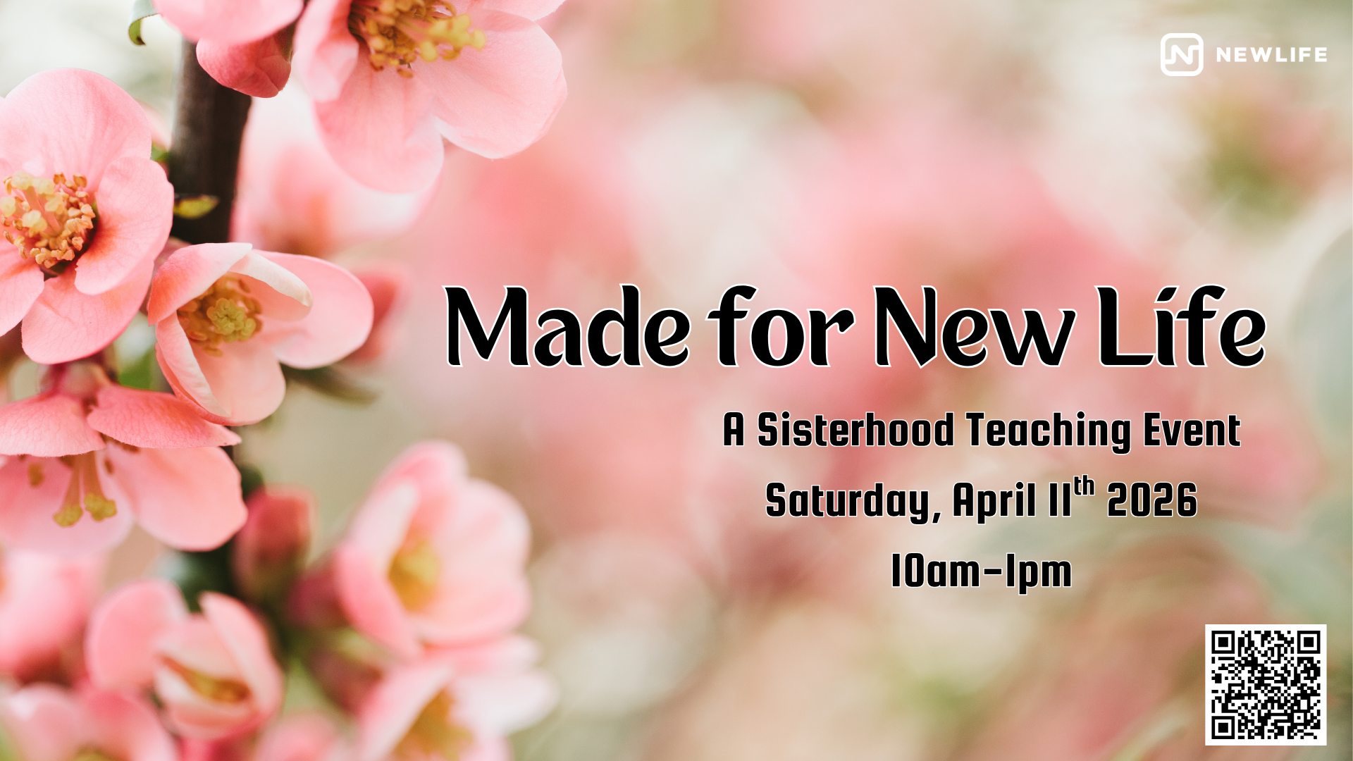 Join us for Made for New Life: A Sisterhood Teaching Event on April 11th from 10am to 1pm for a joyful morning of worship, connection, and encouraging teaching designed to remind every woman that in Christ we are made new and created for more. Choose two of three sessions focused on identity, thriving through Christ, and trusting God through life’s pressing seasons as we celebrate the freedom, renewal, and purpose we have in Jesus.